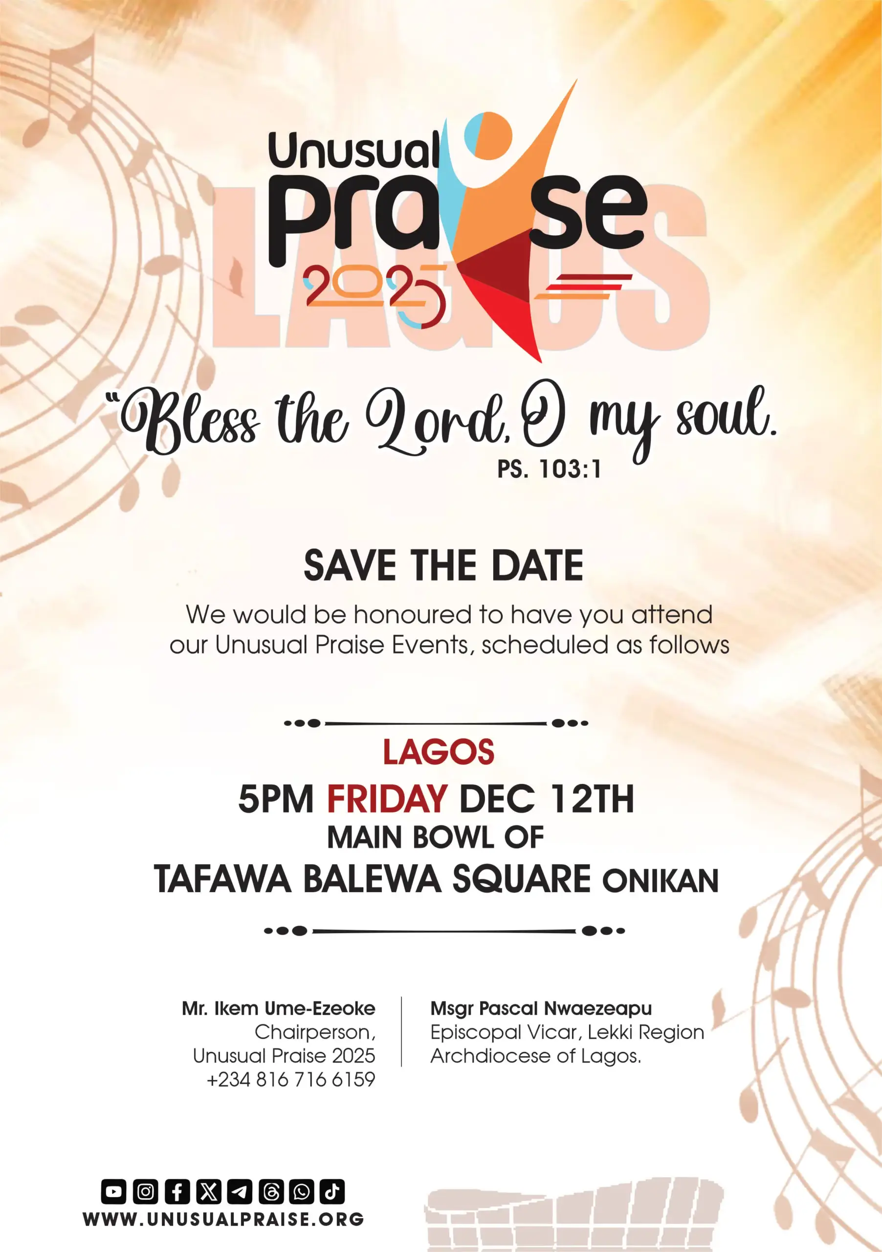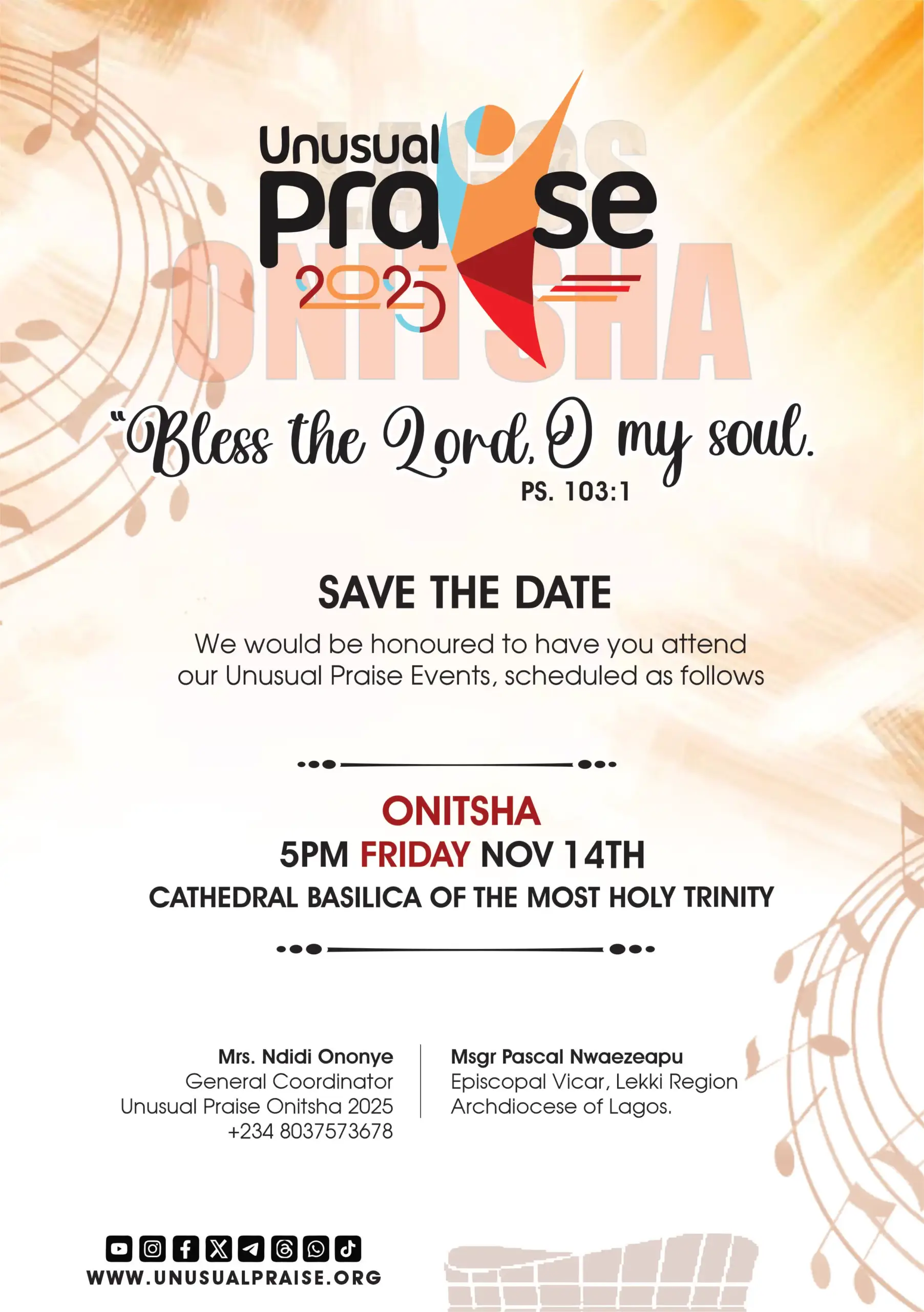 Are You Ready!?! 2 NIGHTS 2 CITIES Unusual Praise is once again set to hold in 2 cities this year; Onitsha & Lagos on the 14th of November, 2025, and the 12th of December 2025 respectively. You should plan to join us! YouTubeFacebookInstagramTwitterWhatsApp A night of unforgettable live praise